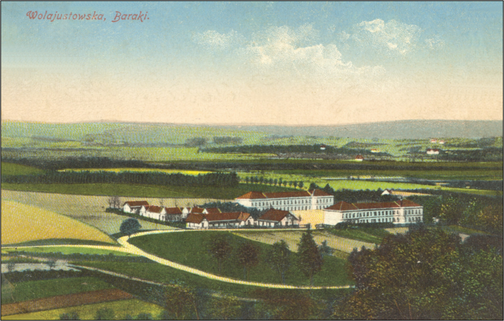 Zamieszczona tu karta widokowa, wydana w roku 1914 przez bliżej nie znane, krakowskie wydawnictwo skryte pod inicjałami „B. M.” – jest swego rodzaju ewenementem. Próżno by na niej szukać Pałacu Decjusza czy chociażby fragmentu Lasu Wolskiego. Przedstawia za to w całej okazałości obiekt o charakterze militarnym – kompleks zabudowań koszarowych, przy późniejszej ul. Modrzewiowej. Ponieważ jednak rzecz miała miejsce tuż przed wybuchem pierwszej wojny, w lewym górnym rogu umieszczono podpis – „Wola Justowska. Baraki.” – tak aby przypadkiem wróg nie zorientował się, że w istocie widzi koszary…