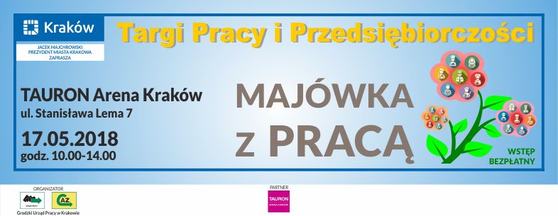Prezydent Miasta Krakowa oraz Grodzki Urząd Pracy w Krakowie, wychodząc naprzeciw potrzebom pracodawców oraz osób, które poszukują zatrudnienia, zastanawiają się nad zmianą dotychczasowej pracy, a także młodzieży stojącej przed wyborem swojej drogi zawodowej, serdecznie zapraszają  na Targi Pracy i Przedsiębiorczości „Majówka z pracą”, które odbędą się 17 maja 2018 r. (czwartek) w godz. 10.00 – 14.00 w TAURON Arenie Kraków, ul. Stanisława Lema 7.