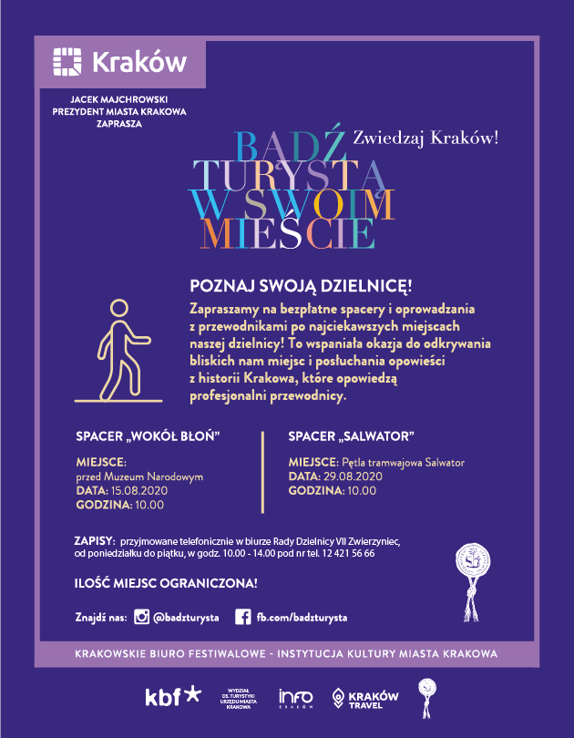 Serdecznie zapraszamy do udziału w bezpłatnych spacerach z przewodnikami po naszej dzielnicy! Spacery są bezpłatne. Liczba miejsc ograniczona. Obowiązują zapisy telefonicznie w godz.10:00 – 14:00 w biurze Rady Dzielnicy VII nr tel. 12 421 56 66.