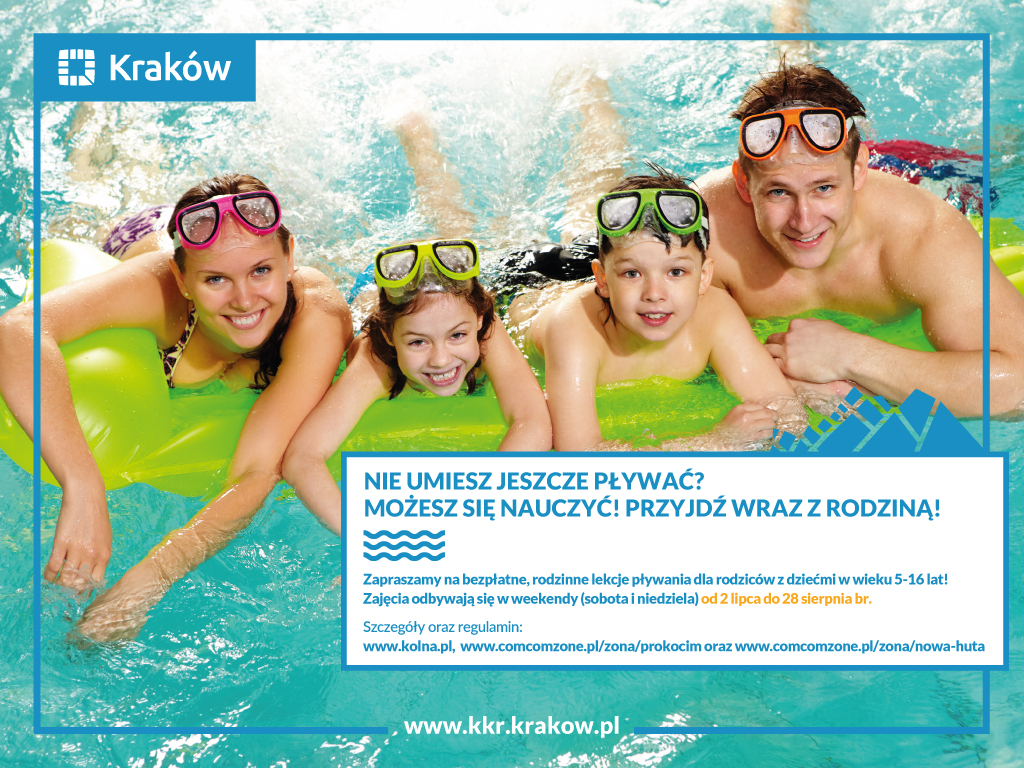 Gmina Miejska Kraków, Ośrodek Sportu i Rekreacji „KOLNA”, Centrum Rozwoju Com Com Zone Prokocim i Nowa Huta serdecznie zapraszają rodziny z dziećmi mieszkające na terenie miasta Krakowa na bezpłatne, rodzinne lekcje pływania. Zajęcia odbywają się w ramach kampanii „Kraków stawia na rodzinę”.