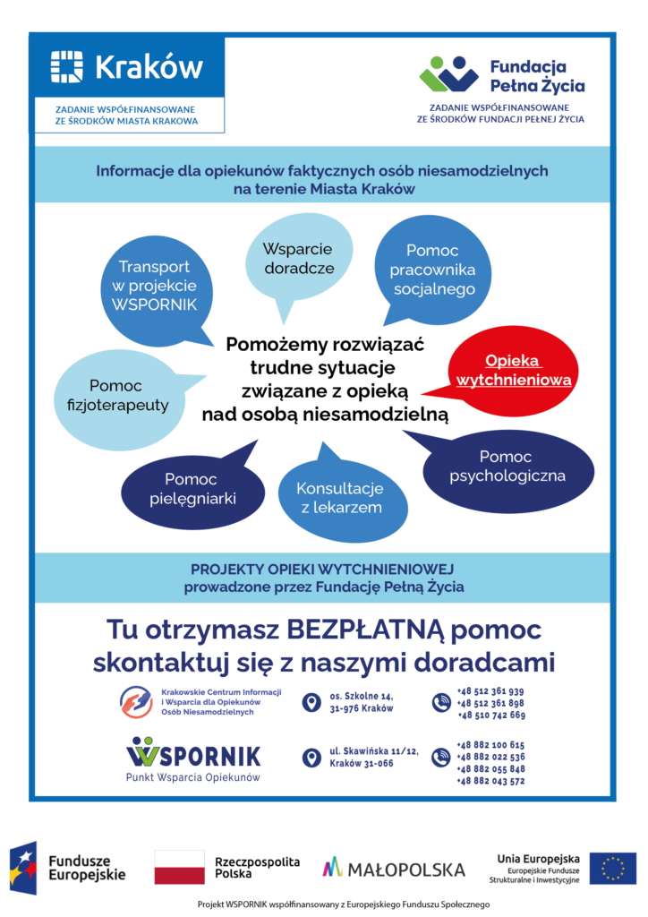 Projekt realizowany przez Fundację Pełną Życia w partnerstwie z Gminą Miejską Kraków ze środków Europejskiego Funduszu Społecznego w ramach Regionalnego Programu Operacyjnego Województwa Małopolskiego.