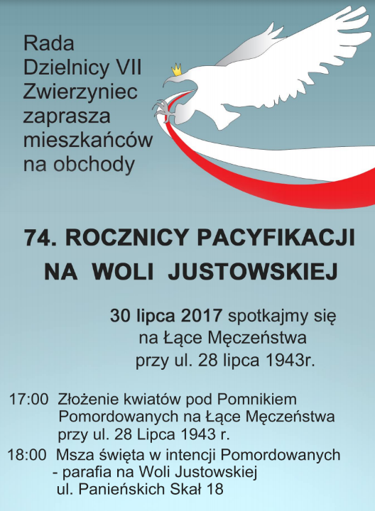 Rada Dzielnicy VII zaprasza mieszkańców na obchody 74. rocznicy pacyfikacji na Woli Justowskiej. 30 lipca 2017 roku spotkajmy się na