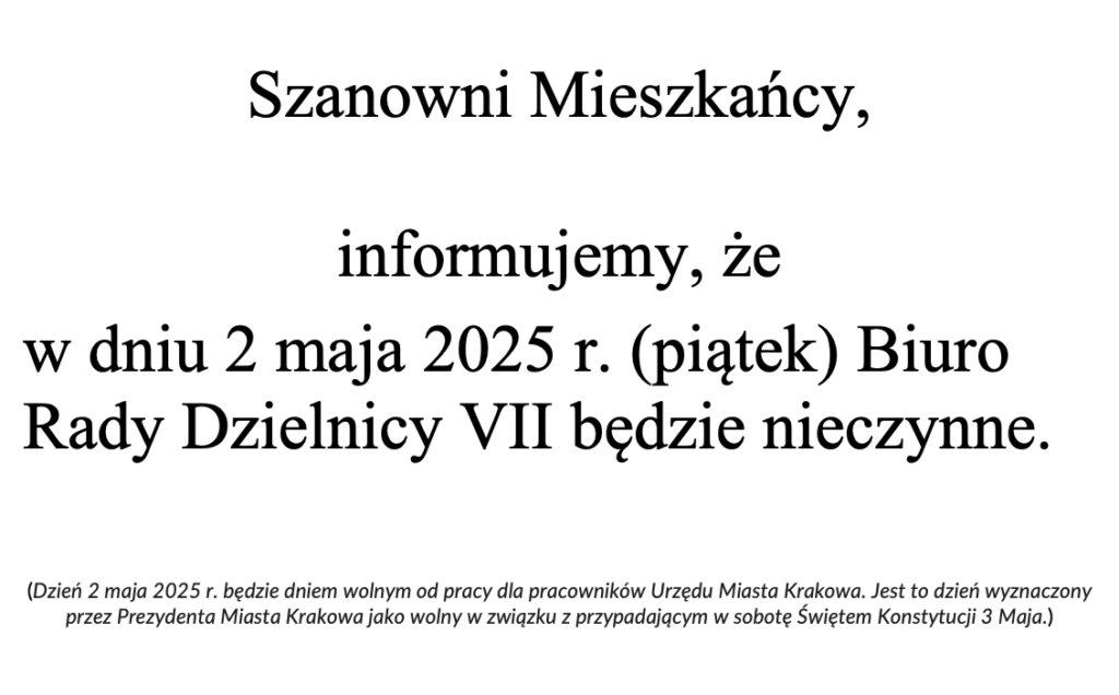 Szanowni Mieszkańcy, informujemy, że w dniu 2 maja 2025 r. (piątek) Biuro Rady Dzielnicy VII będzie nieczynne. (Dzień 2 maja