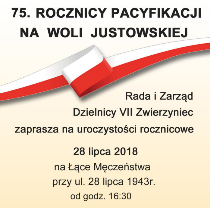 Serdecznie zapraszamy do udziału w uroczystościach związanych z 75. rocznicą pacyfikacji Woli Justowskiej