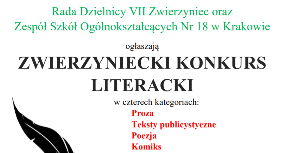 Rada Dzielnicy VII Zwierzyniec oraz Zespół Szkół Ogólnokształcących Nr 18 w Krakowie ogłaszają ZWIERZYNIECKI KONKURS LITERACKI w czterech kategoriach: Proza