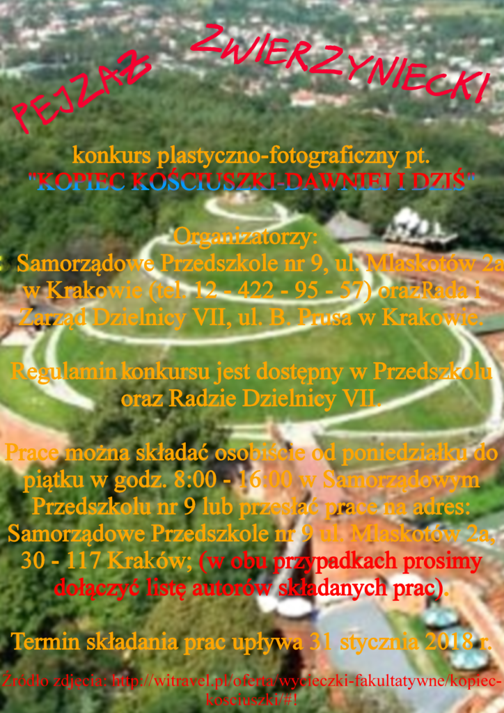 Regulamin konkursu „Pejzaż Zwierzyniecki” Temat przewodni konkursu w roku 2017 to: „Kopiec Kościuszki dawniej i dziś” Kopiec Kościuszki to