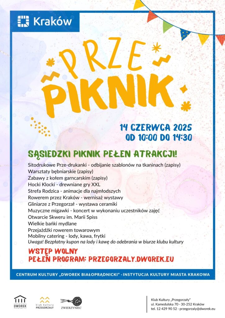 W sobotę 14 czerwca zapraszamy na naszą tradycyjną sąsiedzką imprezę plenerową: PRZE-PIKNIK! Na mieszkańców osiedla czekają warsztaty artystyczne i muzyczne,